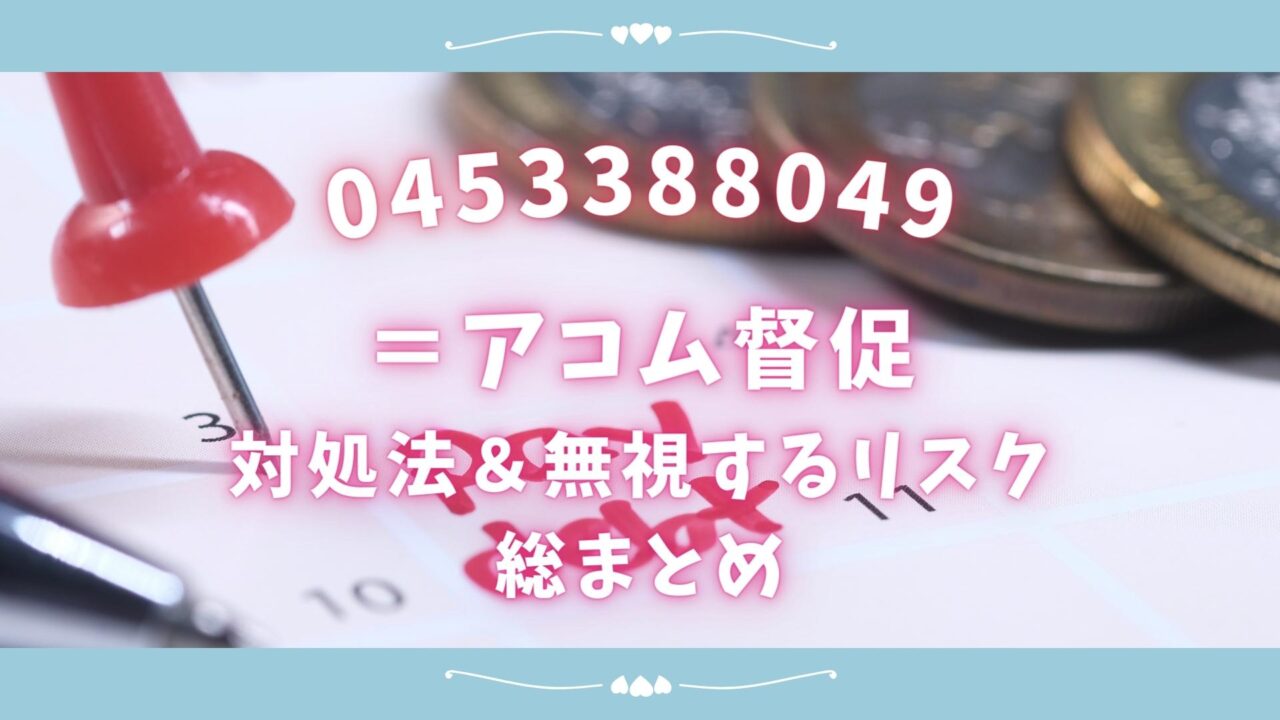 0453388049(045-338-8049)は、アコム株式会社の債権回収部署の番号です。この番号からの着信を無視したり放置したりすると、法的リスクが伴います。