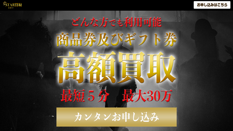 JCBギフトカードや全国百貨店共通商品券の買取申し込みするだけで、即日現金を受け取れる先払い買取現金化業者『スター買取』をご存知でしょうか?